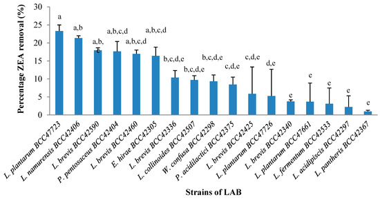 Percentage of ZEA removal from buffer solution by plant-derived LAB. The experiment was performed using a bacterial concentration approximately 109 cfu/mL at 30 °C for 1 h in PBS buffer containing ZEA 0.2 µg/mL. Means (n = 3) with different letters are significantly different according to Duncan’s multiple range test (p < 0.05).