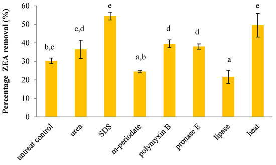 Effect of physical and chemical treatments on ZEA removal by L. plantarum BCC 47723. Values are means ± standard deviations of triplicate experiments. Different letters (a–e) indicated a significant difference at p < 0.05 in each physical and chemical treatments of bacterial cells.