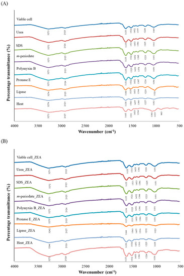 FTIR spectra of ZEA-unexposed (A) and ZEA-exposed bacterial cells (B) in each treatment.