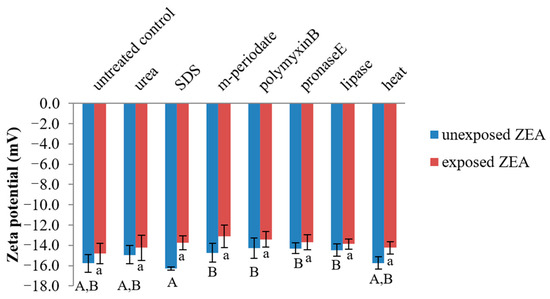 Zeta potential of ZEA-unexposed and ZEA-exposed bacterial cells in each treatment. The capital letter (A,B) represents a significant difference at p < 0.05 in each treatment of ZEA-unexposed bacterial cells and the letter (a) represents a significant difference at p < 0.05 in each treatment of ZEA-exposed bacterial cells.