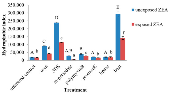 The surface hydrophobicity (H0) of ZEA-unexposed and -exposed bacterial cells of all treatment was determined and is shown in Figure 6. The data indicated that the physical and chemical treatments affected the H0 values. Treating the cells with urea, SDS, and heat significantly enhanced the H0 values of bacterial cells, whereas m-periodate, polymyxin B, pronase E, and lipase treatments were not significantly different when compared with the untreated control. Heat treatment affected the H0 of bacterial cells more than other treatments (p < 0.05). Additionally, the results also indicated that the H0 values in all treatments decreased after the cells were treated with ZEA.