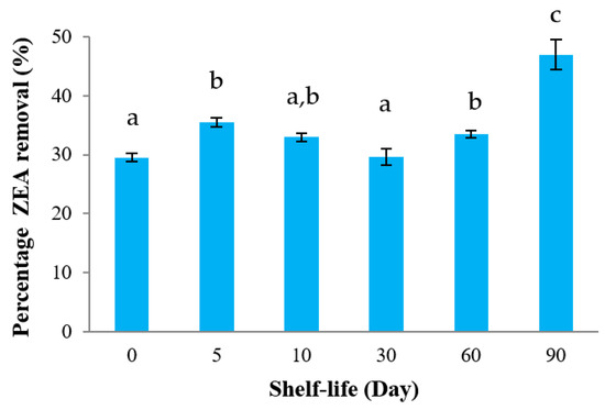 The shelf-life of heat-inactivated cells of L. plantarum BCC 47723 on ZEA removal. Values are means ± standard deviations of triplicate experiments. Different letters (a–c) indicated a significant difference at p < 0.05 in each day.