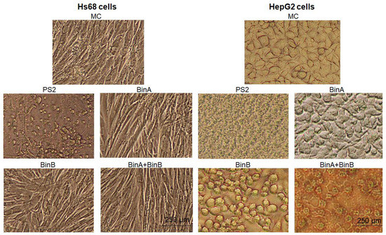 Morphology of Hs68 and HepG2 cells treated with mock control (MC; 1× PBS buffer) and protein toxins. Cells were treated with PS2 (0.5 µg/mL) and Bin proteins (50 µg/mL) for 24 h and then viewed by inverted light microscope (magnified 10×).