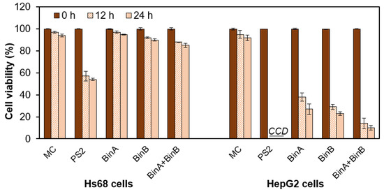 Assessment of one-dose cytotoxic effect of proteins on human fibroblast and cancer cell viability by trypan blue assay. Cells (Hs68 and HepG2) were treated with 0.5 and 50 µg/mL of PS2 and Bin proteins, respectively, at indicated time intervals prior to the assay. In each assay, 1× PBS was used as a mock control (MC). Data correspond to mean values ± standard deviation from at least three different experiments. CCD = complete cell death.