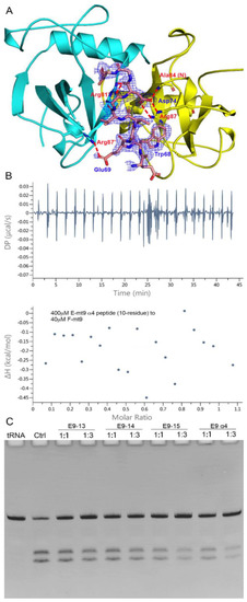 The interactions with the MazF-mt9 toxin are mostly concentrated in the last helix of MazE-mt9 (α4), with the residue Asp74 conferring a dominant impact to the mutual binding (Figure 2A). The single mutation D74A would reduce the affinity by three-fold [18]. We synthesized the α4-peptide (Asp63–Gly77) and measured its affinity to the toxin by ITC. As expected, α4 bound to MazF-mt9 with a high affinity, and the kd value was 87 nM, comparable to that of the full-length MazE-mt9 (kd = 25 nM) [18] (Figure 2B). Next, the binding strength of the peptide to the toxin was also evaluated by its effects against the MazF-mt9 activity. At a molar ratio of 10:1, the α4-helix completely abolished the cleavage activity of the MazF-mt9 enzyme toward tRNALys(UUU) (Figure 2C).