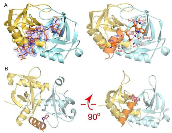 The structures were solved by molecular replacement using the Phaser program with the coordinates of PDB 6KYS and 5WYG as the search models. On the basis of the solution, the models were further rebuilt manually with COOT according to the electron density map [24]. Multiple cycles of refinement alternating with model rebuilding were carried out with PHENIX.refine [25]. The final model was validated by molprobity [26]. The structural figures were produced with PyMOL (www.pymol.org, accessed on 1 March 2021). All data collection and refinement statistics are presented in Table 1.