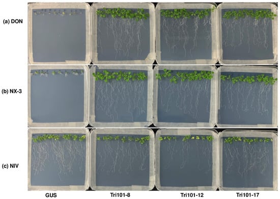 Arabidopsis seedling growth on MS media containing different trichothecenes (10 mg/L). (a) DON; (b) NX-3; and (c) NIV. Three transgenic lines (FgTri101-8, 12, and 17) and a control line expressing GUS were used. The photographs were taken after a two-week incubation.