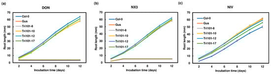 Root length comparison of the Arabidopsis plants expressing FgTri101 grown on trichothecene-containing media. Seeds were germinated on half-strength MS media containing 10 mg/L of the individual toxins. (a) DON; (b) NX-3; and (c) NIV. Root lengths were measured every two days for two weeks. Each treatment contained 36–40 seedlings.