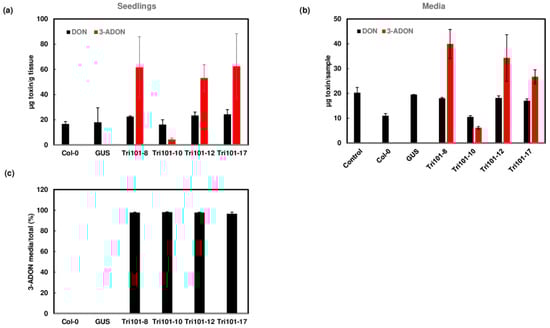 Conversion of DON to 3-ADON and excretion of 3-ADON by FgTri101 transgenic Arabidopsis. (a) DON and 3-ADON in Arabidopsis seedlings after treatment with 50 mg/L DON for 2 days. All plant tissues were extracted for toxins. (b) DON and 3-ADON in the media after Arabidopsis seedlings were treated with 50 mg/L DON for 2 days. Media without plant seedlings served as a control. Toxins in 1.4 mL aliquots from 20 mL media were measured and presented. (c) 3-ADON in the media in comparison to total 3-ADON in the plant and media. Percentage of excreted 3-ADON: 3-ADON media/ (3-ADON media + plant) × 100.