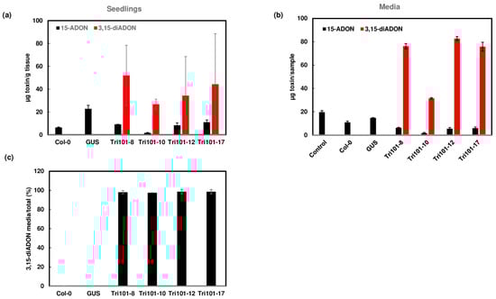 When 15-ADON was added, we observed reduced 15-ADON in FgTri101 transgenic Arabidopsis compared to GUS transgenic Arabidopsis, but we did not detect 3,15-diADON in the FgTri101 seedlings. In a repeated experiment, 3,15-diADON was detected in only a few seedling samples from each transgenic line, suggesting the conversion of 15-ADON to 3,15-diADON (Figure 5a and Figure S4). In contrast, a large amount of 3,15-diADON (98%) was detected in the media when 15-ADON was added to FgTri101 transgenic seedling cultures (Figure 5b). 3,15-diADON was not detected in wild-type Col-0 and GUS transgenic plants or in their growth media. These results indicate that the transgenic Arabidopsis seedlings expressing FgTri101 convert 15-ADON to 3,15-ADON and pump most of it to the media.