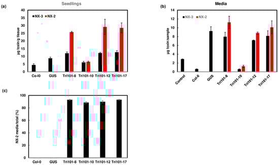 Similarly, NX-3 was converted to NX-2 in transgenic Arabidopsis seedling expressing FgTri101, but there was no conversion in wild-type Col-0 and GUS seedlings (Figure 6a). NX-2 was excreted to the media (Figure 6b), and about 90% of NX-2 was exported to the media (Figure 6c).