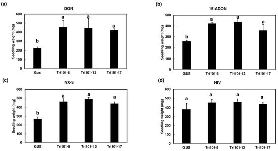 Weight comparison in transgenic Arabidopsis seedlings expressing FgTri101 and GUS with trichothecenes treatments. Arabidopsis seedlings were treated with individual trichothecenes (50 mg/L) for 2 days: (a) DON; (b) 15-ADON; (c) NX-3; and (d) NIV. The data were analyzed by one-way ANOVA and Tukey’s post hoc test using JMP. Bars with different letters indicate statistically significant differences.