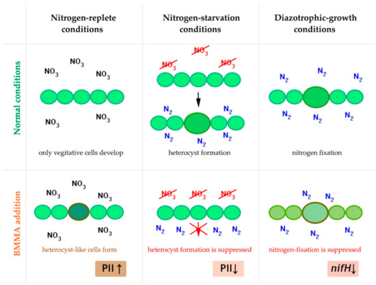 - Singh, H.N.; Rai, U.N.; Rao, V.V.; Bagchi, S.N. Evidence for ammonia as an inhibitor of heterocyst and nitrogenase formation in the cyanobacterium Anabaena cycadeae. Biochem. Biophys. Res. Commun. 1983, 111, 180–187. [Google Scholar] [CrossRef]