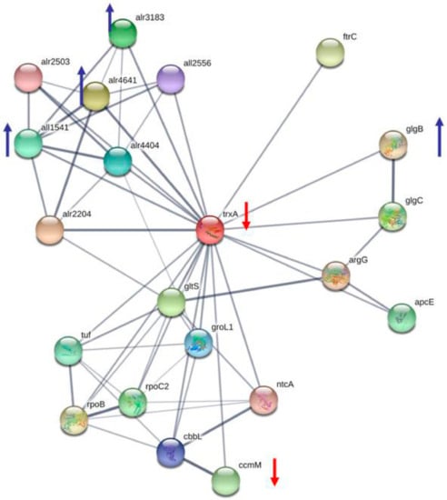 - Shrivastava, A.K.; Pandey, S.; Yadav, S.; Mishra, Y.; Singh, P.K.; Rai, R.; Rai, L.C. Comparative proteomics of wild type, An+ahpC and An∆ahpC strains of Anabaena sp. PCC7120 demonstrates AhpC mediated augmentation of photosynthesis, N2-fixation and modulation of regulatory network of antioxidative proteins. J. Proteom. 2016, 140, 81–99. [Google Scholar] [CrossRef] [PubMed]