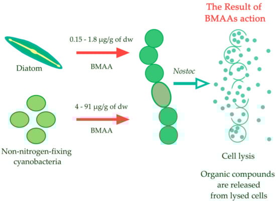 - Popova, A.A.; Koksharova, O.A. Neurotoxic non-proteinogenic amino acid β-N-methylamino-L-alanine and its role in biological systems. Biochemistry 2016, 81, 794–805. [Google Scholar] [CrossRef]
