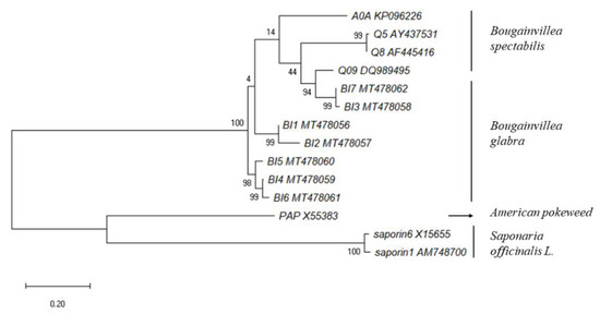 A substance extracted and purified from Bougainvillea was identified as a type I RIP by an enzyme activity test [21,22]. The alkaline protein was named bouganin, with a molecular weight of 26.2 kDa. Previous studies indicated that bouganin possesses rRNA N-glycosylase, polynucleotide: adenosine glycosidase (PAG), and antiviral activity, repressing protein synthesis [22,23]. Two RIPs isolated from Bougainvillea spectabilis significantly inhibited tobacco mosaic virus (TMV); these RIPs are named Q8 isoform in this study [24]. Meanwhile, Bougainvillea RIPs showed a higher activity ratio than other type 1 RIPs, lower toxicity with IC50 value 10−10 M in a cell-free system, and lower activity on whole cells, implying great application potential [25]. However, systematic research on polymorphisms of Bougainvillea RIPs is lacking, and it is worth exploring whether disparate isoforms are different in their active characteristics to find more low-toxicity isoforms. In this study, seven RIP genes were cloned from the leaves of Bougainvillea glabra. The expression polymorphism of Bougainvillea glabra RIP isoforms at the RNA and protein levels was also examined, and we further predicted the different active sites of RIP isoforms, with the aim of finding more promising isoforms for solving the current problems in medicinal applications and providing a theoretical basis for the further development of Bougainvillea glabra RIPs in the field of plant defense.