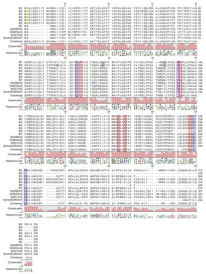 Sequence alignment of Bougainvillea RIPs was performed via the CLC main workbench combined with the Sequence logo. The red frames indicate N-glycosidase active sites, while the blue frames indicate the sites involved in stabilizing enzyme substrate interaction. The gray background shows the predicted glycosylation site, and the yellow background indicates predicted acetylation sites.