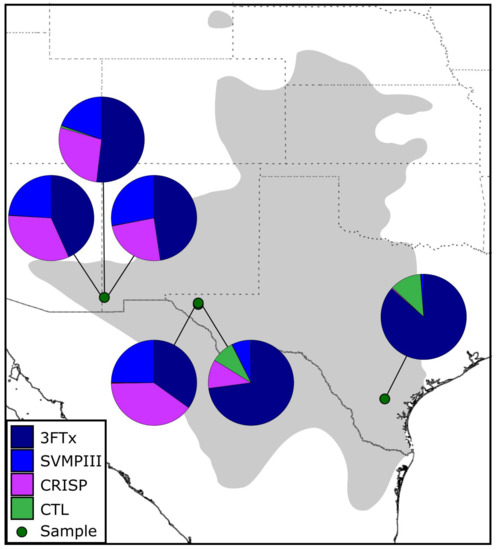 Capturing variation in venom expression in T. nigriceps was only possible by having multiple samples from different localities. Few studies have generated RFS transcriptomes from more than a single individual, thus precluding any look at intraspecific variation in expression. Differences in toxin expression were evident between our samples from different localities (Figure 1). The lone sample from Duval County, Texas, for example, largely lacked SVMPs and CRISPs, instead expressing CTLs as its second-most dominant toxin family (Table 2) and expressing 3FTxs as a higher proportion of its transcriptome than any other sample. Moderate expression of SVMPs in other samples—especially in those from the Chihuahuan Desert—demonstrate the necessity of more complete transcriptomic sampling across its range. Transcriptomes from populations to the north (e.g., Colorado, Nebraska, and Kansas) and south (Mexico) would paint a clearer picture of venom expression variation as it relates to biogeographical (and potentially ecological) differences. Expression differences across individuals and habitats could be local adaptations in response to environmental or ecological selective pressures, or simply intraspecific variation that is difficult to explore with limited sample sizes. Though the difficulty of venom extraction and low yields from small RFS hinders proteomic characterization of T. nigriceps venom, these methods (undertaken by patient researchers) are critical to uncovering the functional activity of venom of these snakes.