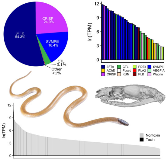 Expression of the Duvernoy’s gland transcriptome of Tantilla nigriceps. Data is the average of six individuals (see Figure S1 for individual data). The pie chart represents proportional toxin gene expression by toxin family. The colored barchart represents expression of each toxin transcript, and the bottom black-and-white graph represents toxin and nontoxin gene expression in the Duvernoy’s gland. Photo of T. nigriceps in life by T. Schramer. Inset skull scan of UMMZ:Herps:69019 accessed via MorphoSource (ark:/87602/m4/M39216) [64]; skull not to scale of inset photo.