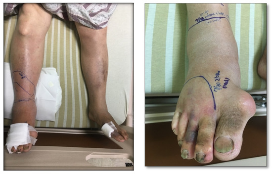 An example of limb swelling and wound necrosis after Taiwan cobra bites. (Left): lower leg swelling progressively to the right knee joint. (Right): a necrosis wound was observed at the 3rd toe.
