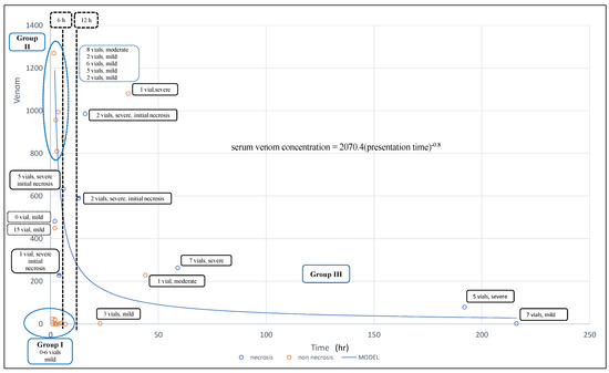 Higher venom levels imply a higher venom load delivered to snakebite victims. For example, the patients in Group I did not develop necrosis because they were mildly envenomated. A recent animal study indicated that more necrotic tissue developed with more cytotoxins administered to mice [13]. However, we should consider the patient’s presentation time when interpreting the serum venom level to predict tissue necrosis development. We can use Equation (2) in such a situation. Using Equation (2), we can anticipate the inevitability of tissue necrosis. These data can be used to assess antivenom efficacy in preventing tissue necrosis development in the future.