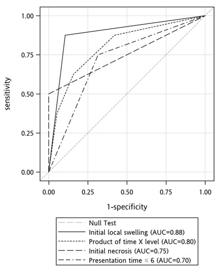 Clinical characteristics with a p-value < 0.1 were further analyzed through multiple logistic regression to identify independent predictors of wound necrosis. Initial local swelling was the only variable that remained in the model after logistic regression. We compared the area under the receiver operating characteristic (ROC) curves of these predictors (Figure 3). The areas under the curve of these predictors were initial local swelling, 0.88; time × serum level, 0.80; initial necrosis. 0.75, and presentation time ≤ 6 h, 0.70. Table 2 displays the sensitivities, specificities, positive predictive values, negative predictive values, and accuracies of the above variables in predicting the development of tissue necrosis.