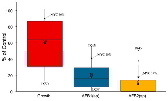 CFEs were added in the growth medium (10% v/v) of Aspergillus flavus with and without thermal treatment, in order to inactivate enzymes and discriminate between their potential impacts on fungal growth and AFB1sp. As shown by the boxplots in Figure 3, CFEs at 10% were less efficient at inhibiting fungal growth than bacteria in dual culture, with a maximal decrease to 40% of the control (mean = 84%, median = 91%) for unheated CFEs (IX19) and to 55% of the control (mean = 98%, median = 100%) for heated CFEs (IX58).