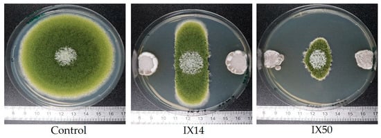 Figure 2 shows the inhibition profiles of A. flavus growth by isolates IX14 and IX50 on CYA, where fungal growth was decreased to 37% and 13% of the control, respectively. As we can observe, the distance between bacterial and fungal colonies is almost the same in both cases; however, isolate IX50 strongly inhibited fungal growth on the edges, which highlights the importance of measuring the area of the whole fungal colony rather than the antagonistic distance.