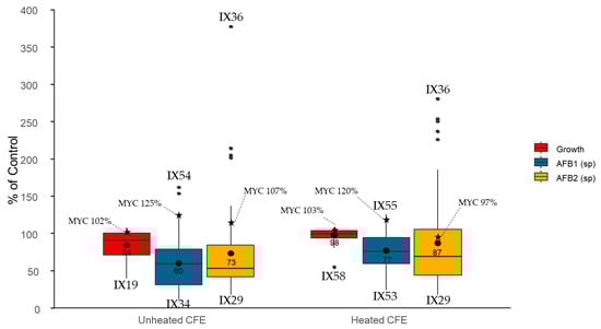 Regarding the effect of CFEs, the results reveal a maximal decrease in AFB1sp for unheated CFEs with 11% of the control (mean = 60%, median = 59%) for IX34, and 23% (mean = 77%, median = 76%) for heated CFEs (IX53). Five unheated CFEs provoked an increase in AFB1sp, going up to 161% of the control (IX54). Heated CFEs increased AFB1sp in ten cases, going up to 125% of the control (IX55). CFEs were less effective at decreasing AFB2sp, with a mean of 73% (median = 53%) and 87% (median = 69%) of the control by unheated and heated CFEs, respectively. The maximal decrease in AFB2sp was observed for the CFE of IX29, with specific production lowered to 18% of the control, whether being heated or not. Ten CFEs caused a rise in AFB2sp, going up to 377% of the control for IX36, while 16 heated CFEs led to similar effects (up to 280% of the control). CFEs of Mycostop® did not cause a significant change in fungal development nor in mycotoxin-specific production.