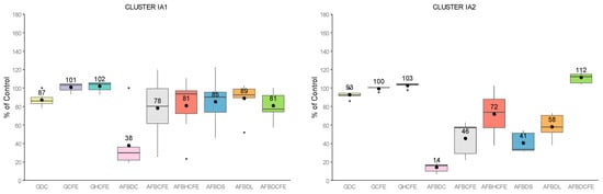Regarding AFB1sp, all subclusters strongly affected toxin accumulation when confronted in the dual culture assay (AFBDC), with reductions ranging from 38% (IA1) to 8% (IIB) of the control on average. Isolates IX07 and IX31 (subcluster IIB) had the strongest mycotoxin reduction activity, with an almost complete decrease in AFB1sp (0.71% and 0.83% of the control, respectively). The impact of CFEs on AFB1sp (AFBCFE) was less pronounced, and variable effects could be noted: from a strong reduction for subcluster IB3 (27%)—particularly isolates IX34 and IX06—to an intermediate reduction for IA2 (46%) and IIB (42%), and a limited reduction for subclusters IIA (77%), IB2 (74%) and IA1 (78%). The subcluster IB1 exhibited singular properties with a strong enhancement of AFB1sp, going up to 141% of the control on average. The thermal treatment (AFBHCFE) generally decreased the influence of CFEs on AFB1sp in all subclusters, except for IB2 (74% vs. 63% of the control after thermal treatment).