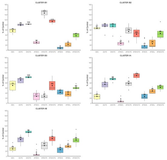 Boxplots of the effect of Streptomyces isolates and CFEs on Aspergillus flavus growth and AFB1-specific production (AFB1sp) (accumulation). Each sub-figure represents a subcluster of the heatmap from Figure S1. GDC = A. flavus growth in dual culture, GCFE = A. flavus growth vs. cell-free extracts (CFEs), GHCFE = A. flavus growth vs. heated CFEs, AFBDC = AFB1sp in dual culture, AFBCFE = AFB1sp vs. CFEs, AFBHCFE = AFB1sp vs. heated CFEs, AFBDS = AFB1 degradation by cells in solid medium, AFBDL = AFB1 degradation by cells in liquid medium, AFBDCFE = AFB1 degradation by CFEs.