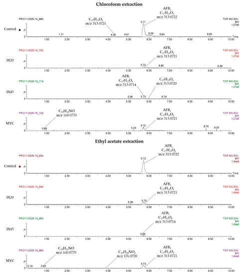 Chloroform extraction spectra exhibit ion peaks at m/z 313.0722 and 313.0721 for the control, corresponding to AFB1 and to what seems to be an AFB1 isomer, respectively. For IX20, only the ion peak of AFB1 at m/z 313.0722 is observed. For IX45, ion peaks at m/z 313.0714 and 313.0720 are present, corresponding to AFB1 and an AFB1 isomer, respectively. For MYC, ion peaks at m/z 313.0721 and 160.0770 are present, corresponding to AFB1 and to an unknown molecule of formula C10H10NO, respectively.