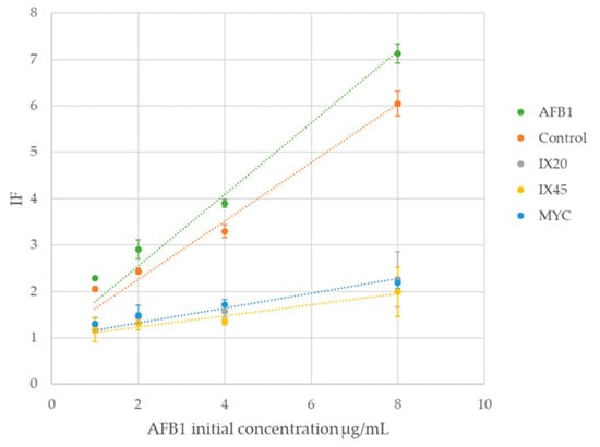 The IF values for an AFB1 standard, the control and the samples were plotted as a function of the AFB1 initial concentration (Figure 7). The intrinsic degradation of the control during the incubation period, compared to the AFB1 curve, is observed, as well as the stronger decreases in genotoxicity caused by the Streptomyces isolates and MYC, compared to the control and to the reference AFB1 concentration.