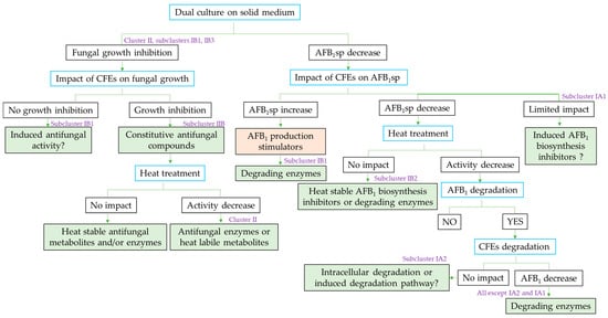 Workflow of the presented study for the preliminary identification of hypothetical antagonistic mechanisms of Streptomyces isolates against Aspergillus flavus development and AFB1 accumulation. Blue-colored rectangles indicate the different experimental stages, and filled rectangles (green, orange) indicate putative mechanisms. Examples of subclusters exhibiting the described mechanism are indicated in purple.