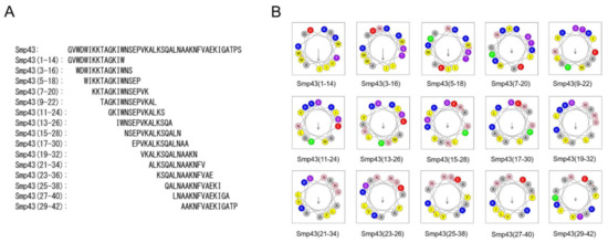 Design of short-chain antimicrobial peptides from scorpion venom-derived long-chain noncysteine-containing peptide. (A) Sequences of Smp43 derived short-chain peptides; (B) Helical wheel projections of the designed peptides. The alkaline and hydrophobic residues were shown in blue and yellow, respectively.