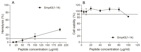 Bacteria resistant to traditional antibiotics have become a serious threat to human health, and novel antimicrobial agents are urgently needed. To evaluate the antimicrobial potential of the designed peptides, MIC determination was performed against several bacterial strains including Gram-positive bacteria Staphylococcus aureus and Enterococcus faecalis, and Gram-negative bacteria Escherichia coli, Klebsiella pneumoniae, Pseudomonas aeruginosa and Acinetobacter baumannii. These bacterial species have been reported to cause the majority of infections involved in antibiotic resistance [43,44]. As shown in Table 1, the MIC values of Smp43(1-14) against these bacterial species were determined to be 5–10 μg/mL, and, compared with other bacterial species tested, Smp43(1-14) was more potent against S. aureus and A. baumannii (MICs: 5 μg/mL). In contrast, the other synthesized peptides were inactive against all of the bacterial strains tested (Table S3).