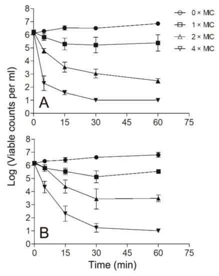The time–killing kinetics of the peptide against the different bacterial species were measured by the plate counting method [76]. Briefly, bacterial cells (2 × 106 CFU/mL) were incubated with 1, 2 and 4 × MIC peptide at 37 °C and 150 rpm for 1 h. Cells without peptide treatment were used as a negative control. At each time interval (0, 5, 15, 30 and 60 min), aliquots of the samples were taken, diluted serially, and spread on Mueller-Hinton agar. The surviving bacterial colonies were counted after overnight incubation.