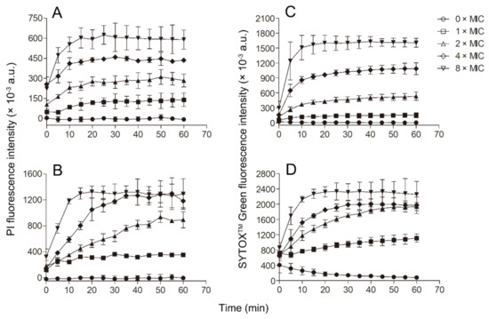Since Smp43(1-14) exhibited better antimicrobial activity against S. aureus and A. baumannii than other bacteria tested, further experiments were performed to evaluate the mode of action of Smp43(1-14) against these two pathogens. Smp43(1-14) showed a concentration-dependent bacterial killing kinetics against S. aureus ATCC29213 (Figure 4A). A similar phenomenon was observed in Smp43(1-14)-treated A. baumannii ATCC19606 (Figure 4B). The time-killing curves of Smp43(1-14) for the bacterial strains resemble those of membrane-targeting antibiotics, which exert their bactericidal activity by pore structure formation in cytoplasmic membrane of bacterial cells [46]; therefore, several fluorescence-based assays were performed to evaluate the effects of Smp43(1-14) on the plasma membrane of the two bacteria. Propidium iodide (PI) is a nucleic acid binding molecule that can permeate only compromised plasma membranes; accordingly, this probe has been used to investigate AMP-induced pore formation in bacterial membrane [47]. As shown in Figure 5A,B, upon the addition of Smp43(1-14), concentration-dependent PI fluorescence increases were observed in both S. aureus and A. baumannii samples, indicating that the peptide integrated with the plasma membrane and induced the formation of pore structures. This phenomenon was confirmed by using SYTOXTM Green, where the molecule displayed similar nucleic acid binding ability but showed distinct spectroscopic properties [48]. The addition of Smp43(1-14) also led to dose-dependent SYTOXTM Green fluorescence increases in these two bacterial species (Figure 5C,D).