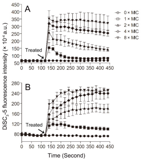 Membrane depolarization was monitored by using the cell membrane potential sensitive probe DiSC3-5 (Sigma, USA) [77,78]. Briefly, the bacterial cells were washed and diluted with 4-(2-hydroxyerhyl) piperazine-1-erhanesulfonic acid (HEPES), buffer (5 mM HEPES, 20 mM glucose, 100 mM potassium chloride, pH 7.4) to achieve a concentration of OD630 = 0.05, and prepared in a 96-well polypropylene microtiter plate. Then, the bacteria were mixed with 0.4 μM DiSC3-5 and incubated in the dark for 90 min to obtain a stable reduction in fluorescence. After that, the peptides were added to the sample and fluorescence was recorded immediately on a microplate reader (Molecular Devices SpectraMax i3x). The excitation wavelength was set at 622 nm and the emission wavelength was 670 nm.