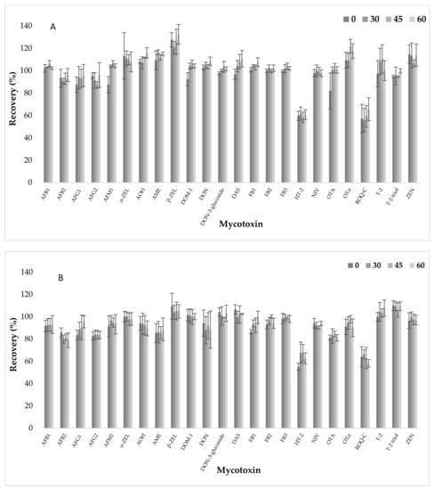 Mycotoxin recovery (%) and standard deviation (bars) using VAMS for 3 different haematocrit levels (30, 45 and 60) at (A) low and (B) high mycotoxin concentration. Mycotoxin concentrations at low concentration: 0.5 ng/mL (aflatoxin B1 (AFB1), B2 (AFB2), G1 (AFG1), M1 (AFM1), G2 (AFG2), ochratoxin A (OTA) and ochratoxin alpha (OTα)), 2.5 ng/mL (deepoxy-deoxynivalenol (DOM-1), deoxynivalenol (DON), deoxynivalenol-3-glucoside (DON-3-glucoside), diacetoxyscirpenol (DAS), HT-2 toxin (HT-2) and T-2 toxin (T-2)) and 10 ng/mL (alpha-zearalenone (α-ZEL), alternariol (AOH), alternariol monomethyl ether (AME), beta-zearalenone (β-ZEL), fumonisin B1 (FB1), B2 (FB2), B3 (FB3), nivalenol (NIV), roquefortin C (ROQ-C), T-2 triol toxin (T-2 triol) and zearalenone (ZEN)). Mycotoxin concentrations at high concentration: 12.5 ng/mL (aflatoxin B1 (AFB1), B2 (AFB2), G1 (AFG1), M1 (AFM1), G2 (AFG2), ochratoxin A (OTA) and ochratoxin alpha (OTα)), 62.5 ng/mL (deepoxy-deoxynivalenol (DOM-1), deoxynivalenol (DON), deoxynivalenol-3-glucoside (DON-3-glucoside), diacetoxyscirpenol (DAS), HT-2 toxin (HT-2) and T-2 toxin (T-2)) and 250 ng/mL (alpha-zearalenone (α-ZEL), alternariol (AOH), alternariol monomethyl ether (AME), beta-zearalenone (β-ZEL), fumonisin B1 (FB1), B2 (FB2), B3 (FB3), nivalenol (NIV), roquefortin C (ROQ-C), T-2 triol toxin (T-2 triol) and zearalenone (ZEN)).