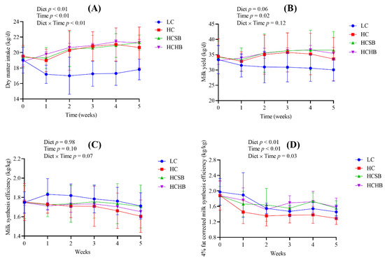 Diet, time and diet × time interaction significantly affected the dry matter intake (DMI) (Figure 1A). There were no significant differences in the DMI among the HC group, HC with sodium butyrate (HCSB) group, and HC with sodium β-hydroxybutyrate (HCHB) group. The DMI of these three groups was significantly higher than that of the low-concentrate (LC) group. Diet tended to affect milk yield (Figure 1B). The milk yield of the LC group exhibited a steep drop for the first and second week before decreasing slowly. The milk yield of the HC group peaked at the third week and began a gradual decline. The milk yield of the HCSB group also reached a peak at the third week and remained at the peak level until the end of the trial. The milk yield of the HCHB group gradually reached a peak at the fourth week and then began to decline. Time significantly affected milk yield, but diet × time interaction did not affect milk yield (Figure 1B). Diet, time and diet × time interaction did not affect milk synthesis efficiency (Figure 1C), but significantly affected 4% fat corrected milk (FCM) synthesis efficiency (Figure 1D). The milk synthesis efficiency and 4% FCM synthesis efficiency in the HC group were the lowest in the four groups (Figure 1C,D).
