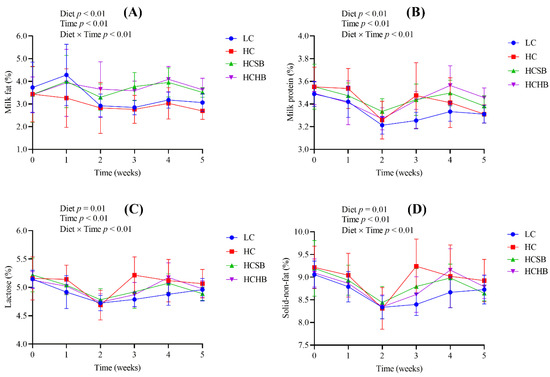 Diet, time and diet × time interaction significantly affected milk components including milk fat, milk protein, lactose, and solid-non-fat (Figure 2). The milk fat contents in the HCSB and HCHB groups were significantly higher than those in the LC and HC groups. All the four milk components were not significantly different between the HCSB and HCHB groups.
