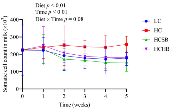 As shown in Table 3, compared with the LC group, all the leucocytes (lymphocyte, monocyte, and neutrophil) significantly increased in the HC group. Compared with the HC group, both the number of white blood cells, lymphocytes, and monocytes in the HCSB group and the number of white blood cells and lymphocytes in the HCHB group significantly decreased. All the leucocytes were not significantly different between the HCSB and HCHB groups. Both diet and time significantly affected SCC in milk, but the diet × time interaction did not affect SCC (Figure 3). The SCC in the HC group was significantly higher than that in the other three groups from the second week.