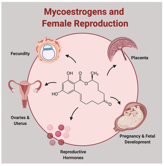 The current literature offers compelling evidence that mycoestrogen exposure affects female reproductive organs and hormone activity. Often, differential responses are observed based upon the dose and timing of exposure. Notably, adverse fetal outcomes were mostly observed at the higher doses tested in animal studies. Given the widespread exposure to mycoestrogens in the food supply and its consequences for female reproduction in experimental studies, it is imperative to conduct epidemiological studies of the impact of mycoestrogens on human health. Key attention should be placed on sensitive time points, such as development and pregnancy, and in populations vulnerable to high exposure, such as children and communities with high consumption of contaminated food products.