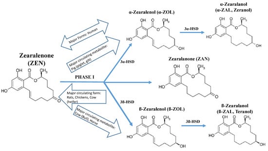 Phase 1 biotransformation of zearalenone (ZEN) by species. ZEN is metabolized by hydroxysteroid dehydrogenases (HSD) into biologically active metabolites, α-ZOL and β-zearalenol (β-ZOL) as well as zearalanone (ZAN). α-ZOL is further reduced to form zeranol (α-zearalanol).
