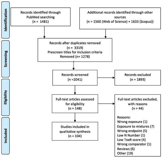 The literature search identified 4674 articles (1481 articles in PubMed, 1560 in Web of Science, and 1633 in Scopus), with 3319 remaining after duplicates were removed (see Figure 3 for complete PRISMA Flow Diagram). Title screening in Endnote eliminated 1278 articles that did not meet inclusion criteria outlined in the review protocol and PECO (person, exposure, comparator, outcome) statement (Table 1). 2041 articles were assessed by title and abstract in Rayyan QCRI, and 1893 were excluded because they did not meet inclusion criteria, full text articles could not be accessed (n = 6) or were published prior to 2000. In total, 148 papers were read for full text eligibility and reviewed for RoB using ToxR, of which 104 studies were included in the narrative review based on Klimisch scores of 1 or 2 (ToxR scores for all reviewed full texts are provided in Supplementary Table S2). Model systems reviewed include in vitro studies in cell lines derived from humans, pigs, cows, rats, mice, hamster, sheep and horse, while in vivo studies ranged from rats, mice, pigs, dogs, cows and included a variety of routes of administration (contaminated feed, implants, oral gavage, intraperitoneal injection and in utero exposure.)