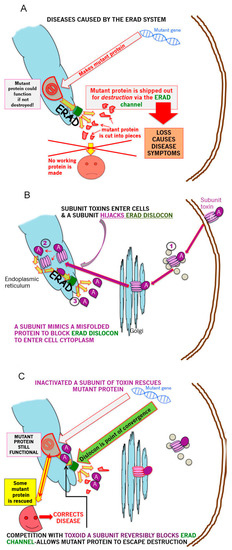 Both VT and CT hijack endoplasmic reticulum associated degradation (ERAD) for A subunit cytosolic access. ERAD is the cellular quality control mechanism by which nascent polypeptides are screened for correct three dimensional folding [210]. It involves their sampling by various ER chaperones [211,212] and folding enzymes [213], unfolding/refolding opportunities [214], unfolding [215], ubiquitinylation [216], ER-cytosolic transfer [217] and proteasomal degradation [218]. Protein misfolding is central in many genetic diseases, and in those with small mutations that do not ablate function, ERAD plays a key role in initiating/amplifying deficiency disease symptoms [219].