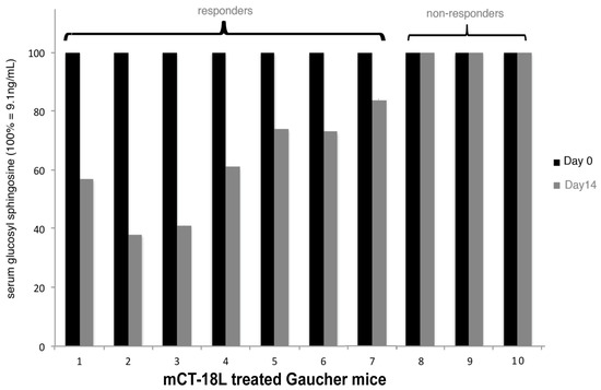 In seven of the ten treated mice, a decrease in glucosyl sphingosine was observed ranging from 20% to 60%. This suggested that there was an additive effect on repeated mCT i.p. injection, as seen for CF mice, but unlike the CF mice, as yet unknown factors can prevent an mCT response in 30% of Gaucher mice.