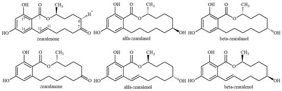 - Rogowska, A.; Pomastowski, P.; Sagandykova, G.; Buszewski, B. Zearalenone and its metabolites: Effect on human health, metabolism and neutralisation methods. Toxicon 2019, 162, 46–56. [Google Scholar] [CrossRef]