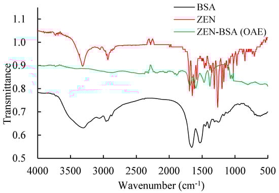 Infrared spectroscopy (IR) can identify compounds by characterizing their molecular structures and functional groups. Since the immunogen ZEN-BSA is a new compound that is formed by coupling ZEN and bovine serum albumin (BSA), IR is used to characterize whether the new compound contains the characteristic structures of ZEN and BSA, so as to determine whether the synthesis of the new compound is successful. The IR of the immunogen ZEN-BSA synthesized using the OAE method was compared with the IR of BSA. The IR absorptions were similar, between 1500 and 1700 cm−1, as evidenced by the peaks produced by the amine group in BSA (Figure 2), indicating the presence of BSA in the artificial immunogen ZEN-BSA. In addition, the IR of the immunogen ZEN-BSA and ZEN had two similar absorptions in the regions 2100–2300 cm−1 and 1250–1350 cm−1, which are the characteristic peaks produced by hydroxyl, and esters in ZEN. This is an indication that the immunogen ZEN-BSA contains ZEN. BSA does not exhibit any absorption in the same areas. Our findings imply a successful synthesis of ZEN-BSA.